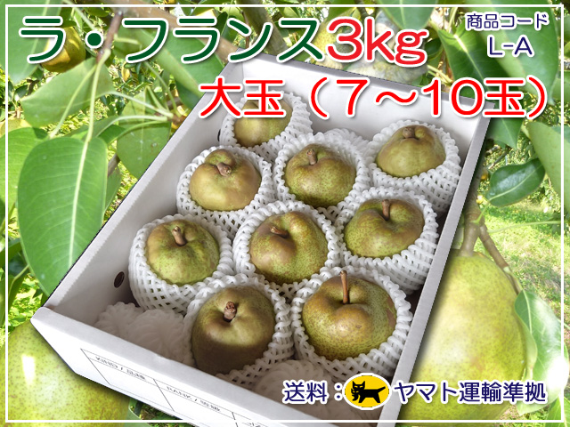 ラ・フランス3 ㎏大玉(7~10 玉) ツイートする シェアする 販売価格: 3,300円(税込み) 会員価格 (税込み) 通常価格 (税込み) 在庫 0 商品コード L-A JANコード 熨斗なし 熨斗あり(無地) 熨斗あり(お歳暮) 数量 - + 在庫切れのため注文いただけません。 カテゴリー ラ・フランス